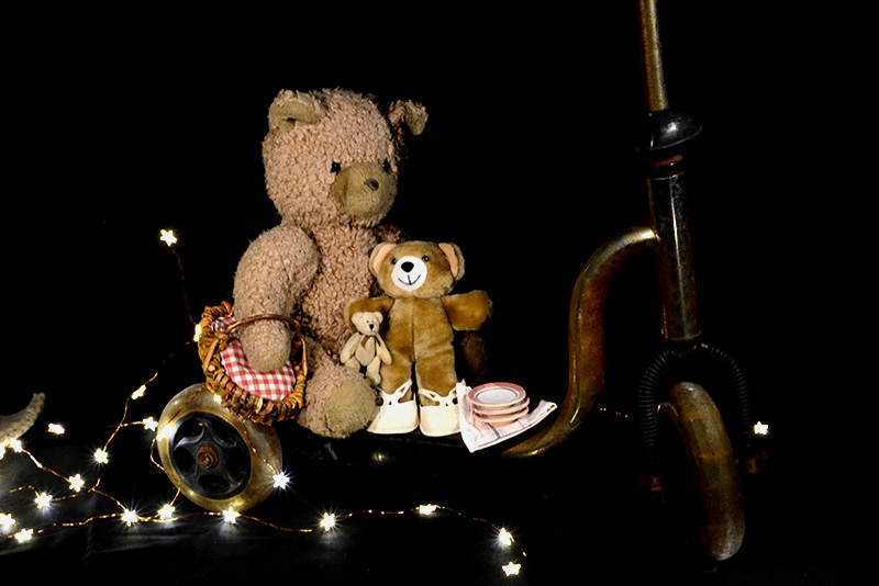 Avec Jouets d’hier à la lampe de poche, Claire Pantel fouille dans les tiroirs des grands-parents d’aujourd’hui et dépoussière des objets sortis tout droit d’un rêve familier. Son univers s’invite naturellement avec le Duo Bellevue, Marcel à la guitare et Léon à la contrebasse. Les notes de musique flottent parmi les jouets en écho au swing des deux Jacques, Prévert et Tati.